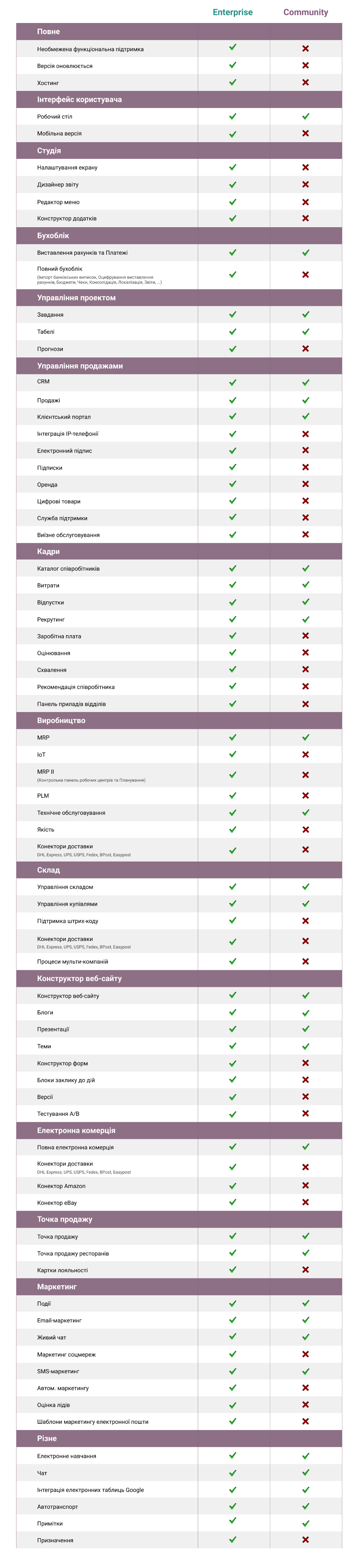 Odoo Enterprise (ліцензійована) та Odoo Community (з відкритим кодом).